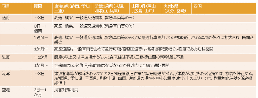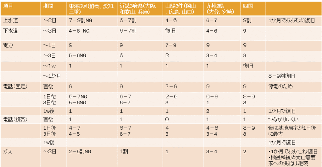 南海トラフ巨大地震は超広域に及ぶため地域によりその被害も濃淡がありますが、東海、近畿、山陽、四国及び九州の各地方のライフライン・インフラ被害の概要をまとめました。