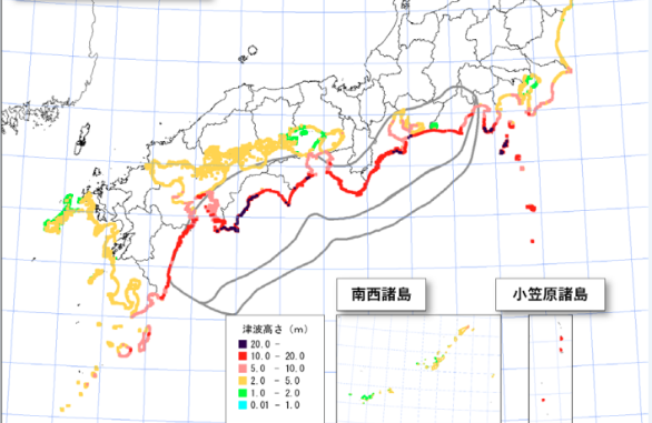 南海トラフ巨大地震は、東海沖、四国沖などその震源地に複数のパターンがありますが、いずれも最悪ケースでM9クラスのエネルギーが比較的陸地から近い場所で発生するため、巨大な津波が短時間でやってきます。具体的には