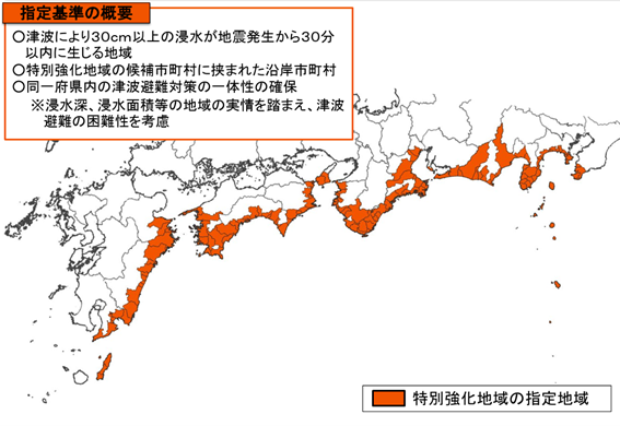 また、内閣府は、、30cm以上の津波が30分以内に到達する可能性のある下の図の地域を津波特別強化地域として指定していますが、千葉県の房総半島から鹿児島県の種子島にわたる超広域に及びます。特に高知県や宮崎県、静岡県など沿岸部に都市が点在する地域は大きな被害が予想されます。多くの生命・財産が失われるととともに、都市の生活・経済機能などを喪失し、復興にも長い月日を要するでしょう。